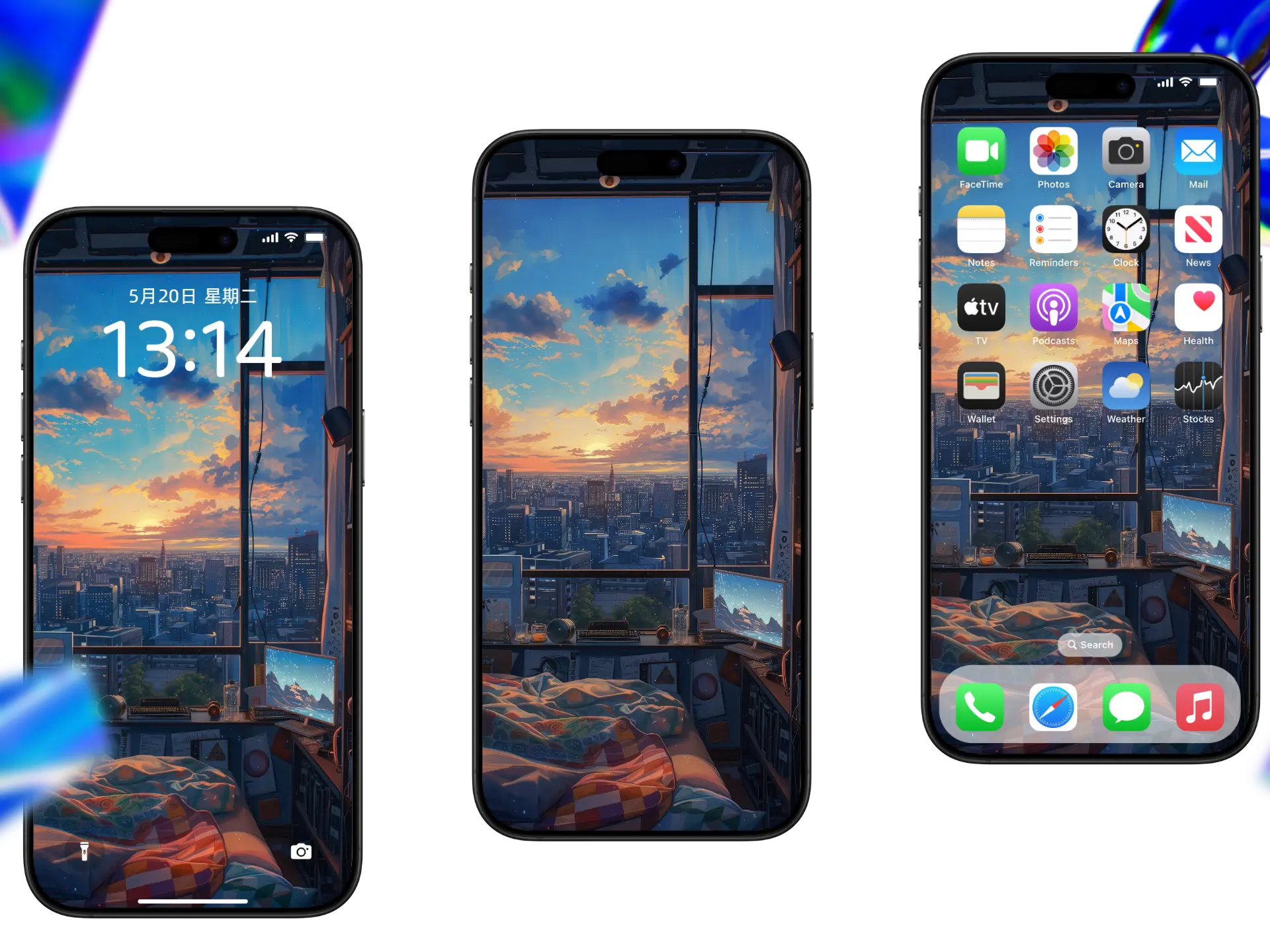 这款都市日落卧室4K手机壁纸,通过落地大窗将窗外城市天际线与室内生活场景融合:黄昏光线透过云层洒满整个房间,温暖的橙色余晖与深蓝夜幕交织,营造出一份宁静而治愈的氛围。