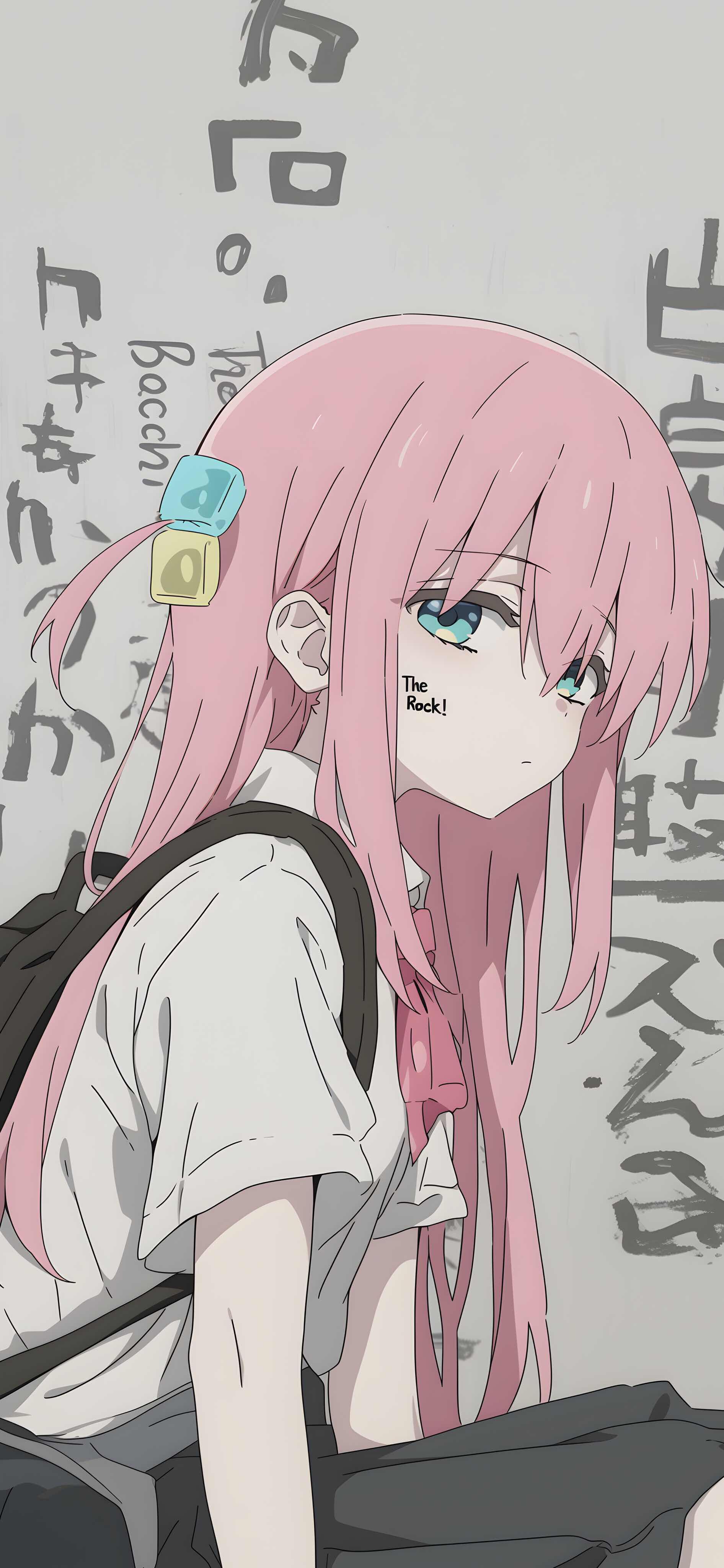 这款 1892×4096 4K 手机壁纸 聚焦《孤独摇滚!》主角 波奇酱:她以 粉色渐变蓝色发梢 和几何发卡为亮点,微睁单眸、侧身坐姿,散发 甜酷校园风。背景是一面极简灰色涂鸦墙,呼应她叛逆又灵动的性格。高清画质完美展现 渐变发色 和 校园涂鸦元素。适合孤独摇滚壁纸、4K动漫手机壁纸、甜酷少女壁纸爱好者下载。