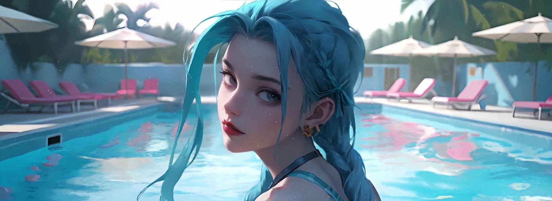 金克斯白皙的肌肤在阳光的照耀下呈现出细腻的质感,颈部的线条优美流畅。她佩戴着标志性的蓝色耳环,与发色相互呼应,增添了几分个性。背景是明亮的天空,几缕光芒点缀其中,营造出一种梦幻而温暖的氛围。