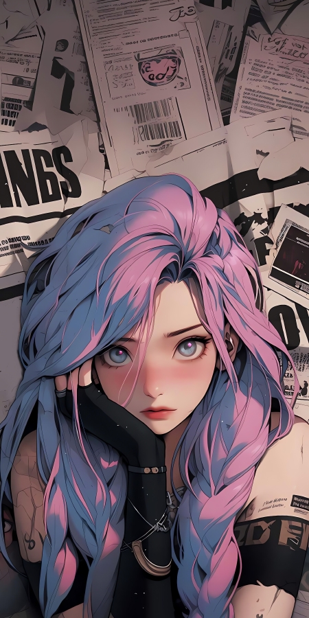 少女身着黑色高领上衣,颈部佩戴着朋克风格的金属饰品,这些细节进一步强化了角色的风格定位。背景是一堆杂乱的报纸、海报和文字,营造出一种urban和地下文化的氛围。这样的背景设计与少女鲜明的形象形成了强烈的对比,增加了画面的层次感和故事性。