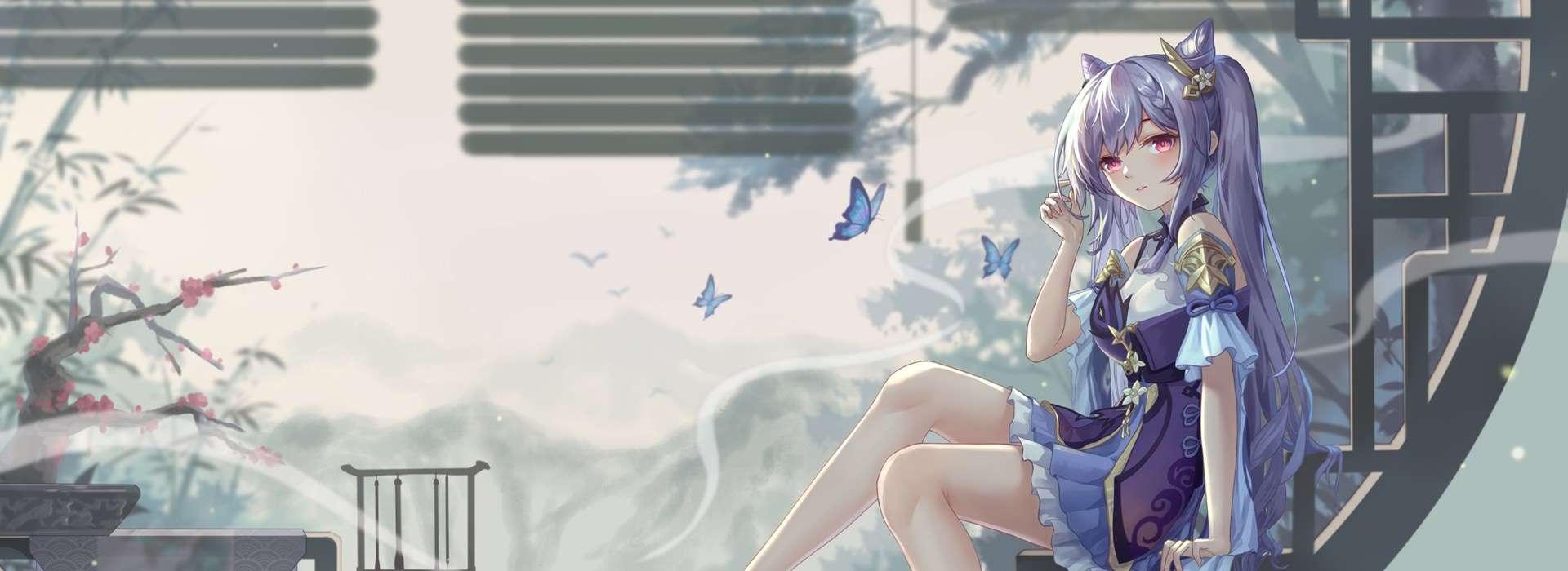 背景里可见**紫藤花廊**与远处的瓦山河畔,晨曦微光透过花影洒在刻晴身上,淡淡冷光与紫色氛围相呼应,凸显她“孤傲却守护”的雷属性王权。刻晴侧坐栏杆,折扇半掩笑靥,静静凝望,仿佛在思索下一场战斗的序章。