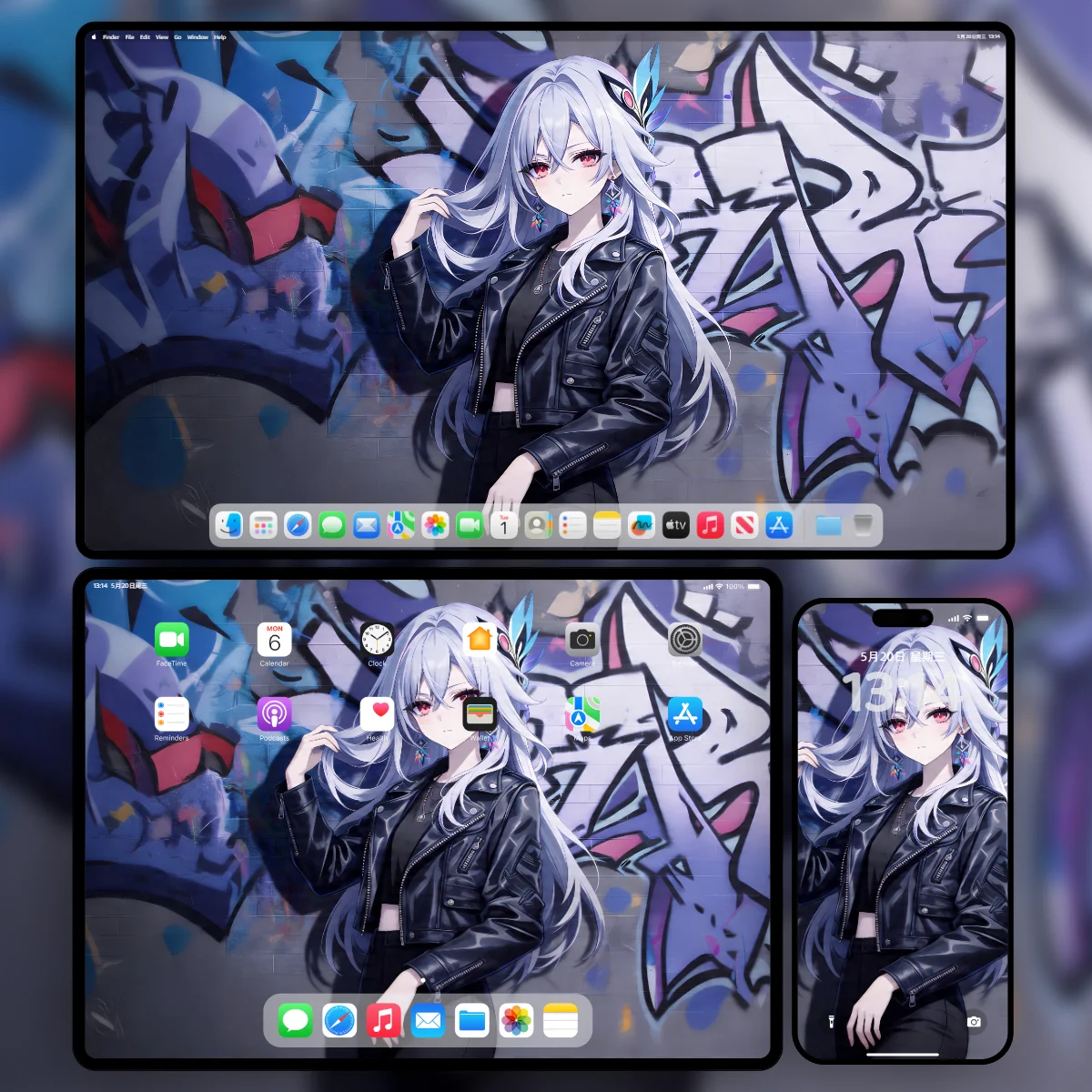 考虑到这张图的高对比度特性,我们在制作样机和切图时,特别保留了 100% 的色彩宽容度,无论是 iPhone 的 OLED 屏幕还是 Mac 的高刷屏,都能完美还原皮衣的光泽和涂鸦的细节。需要这套素材的朋友,可以直接在下方下载打包好的 ZIP 无损文件,三端尺寸已经全部齐备。如果你对这种打破常规设定的“现代私服风”或者深色系壁纸感兴趣,建议去咱们的 原神精选壁纸库 里深挖一下,里面收录了大量不同画风的顶级二次元画作,绝对有你中意的那一款。