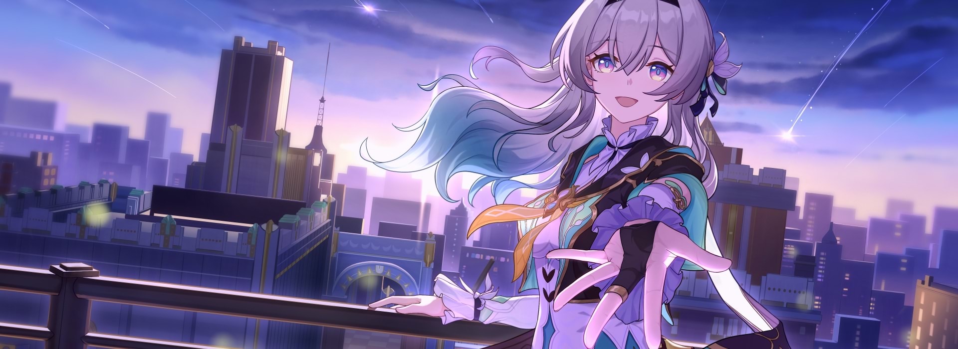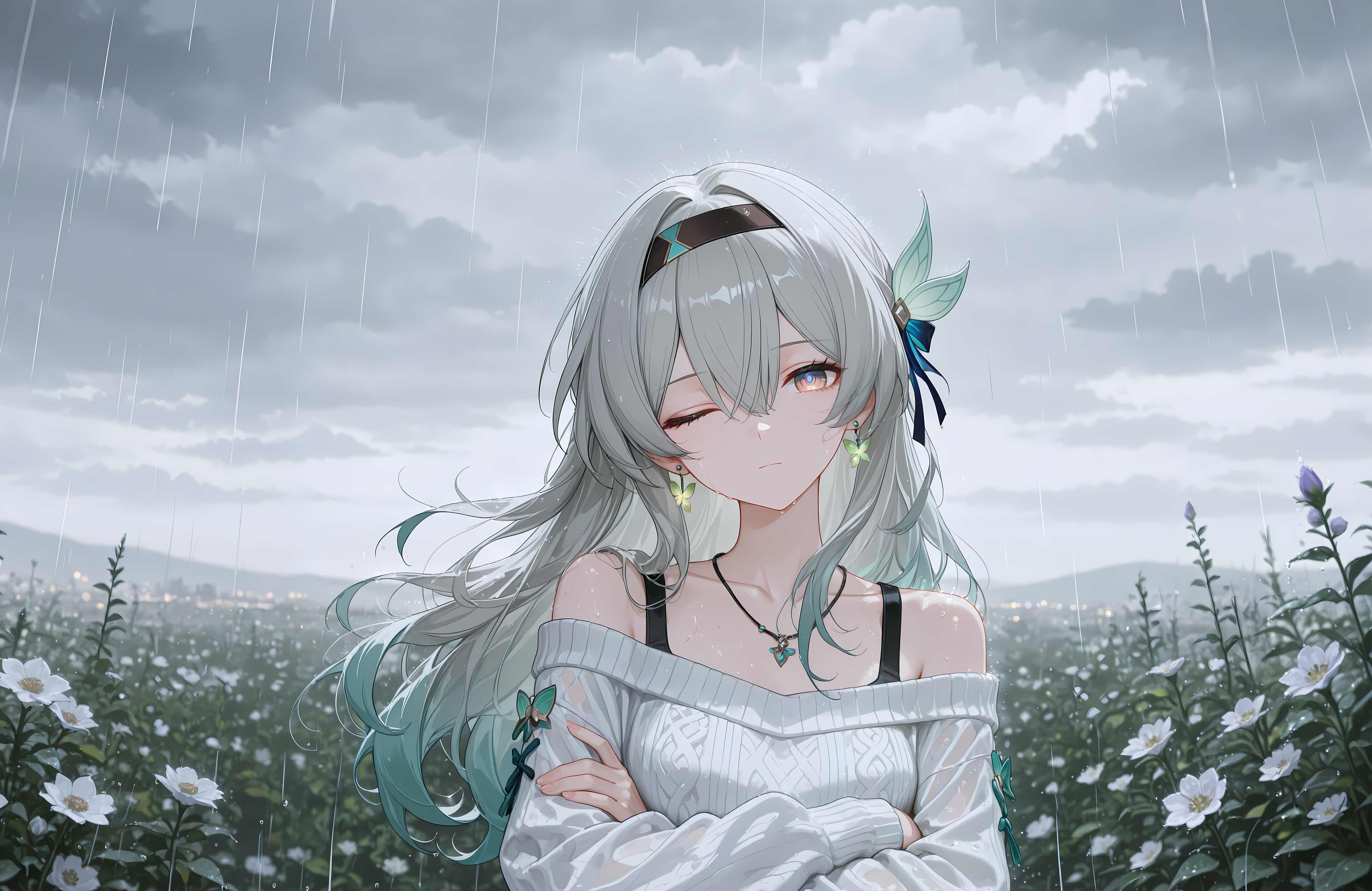 这张 《崩坏:星穹铁道》流萤 4K 电脑壁纸 将“雨中花海”与“沉思少女”完美融合:银灰长发随雨披散,发尖点缀薄荷绿发梢与花叶发饰,诠释她柔中带刚的探索者气质。她身着白色露肩针织衫,双臂交叠于胸前,轻微侧眸,闭眼感受细雨落在肩头,流露出 静谧而坚毅 的神情。